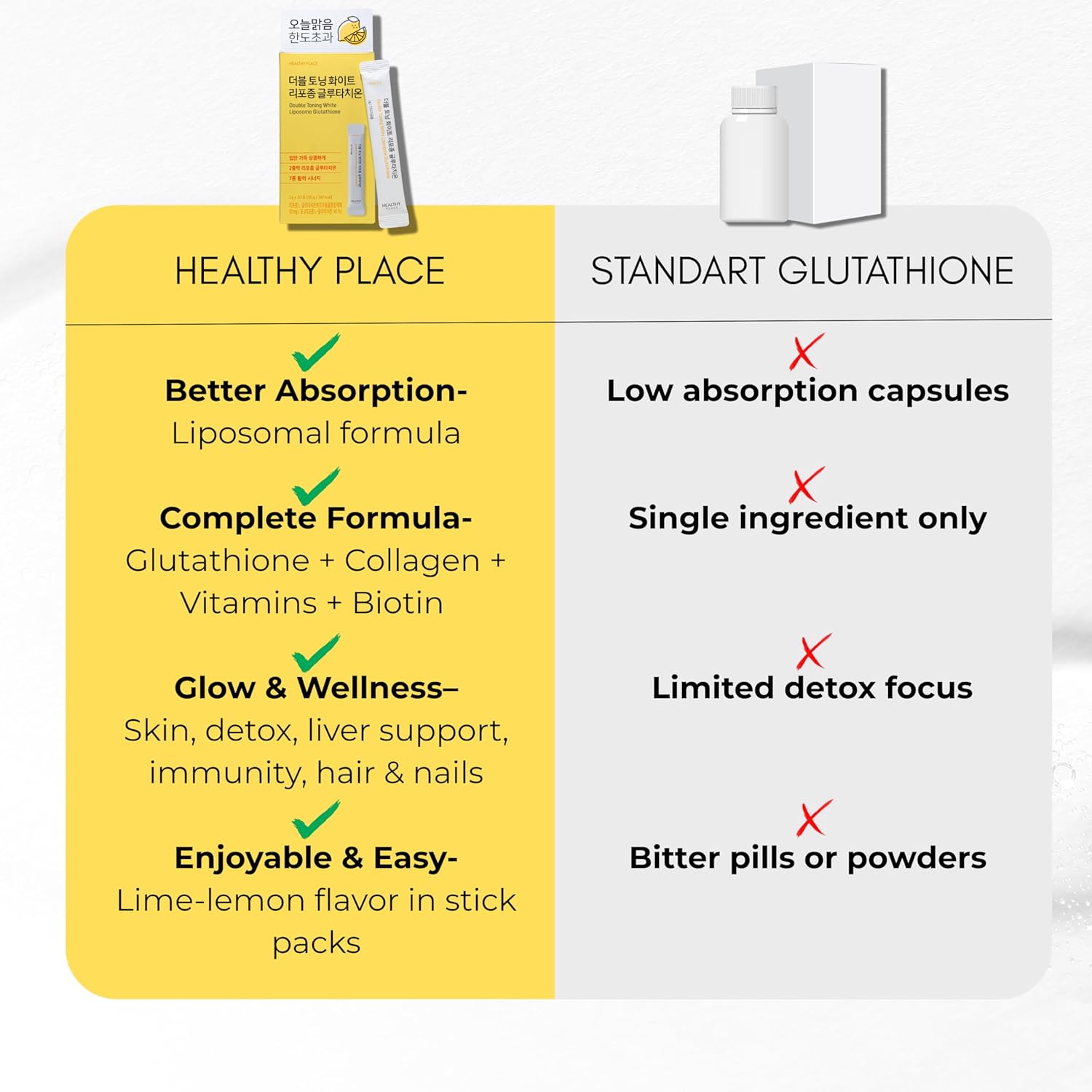 • HEALTHY PLACE is a Korean wellness brand dedicated to “beauty from within,” using advanced delivery technologies like liposomal absorption to maximize ingredient effectiveness.